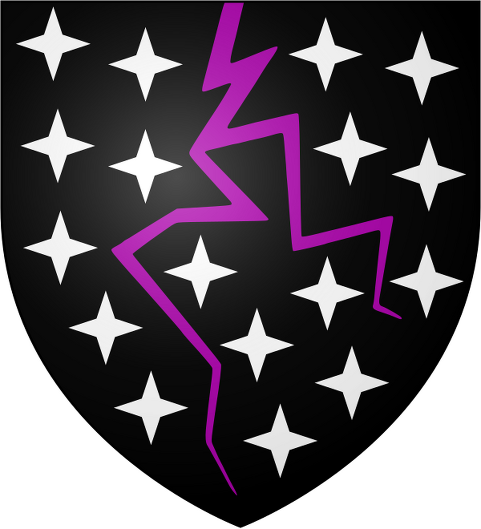 Dondarrion Hanesi'nin arması. Siyah zemin üzerinde dört köşeli yıldızlarla süslenmiş çatallı mor şimşek.