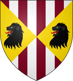4'e bölünmüş zeminde mor beyaz çizgili 2 alan ve yanlarında sarı zemin üzerinde siyah bir aslan başı |